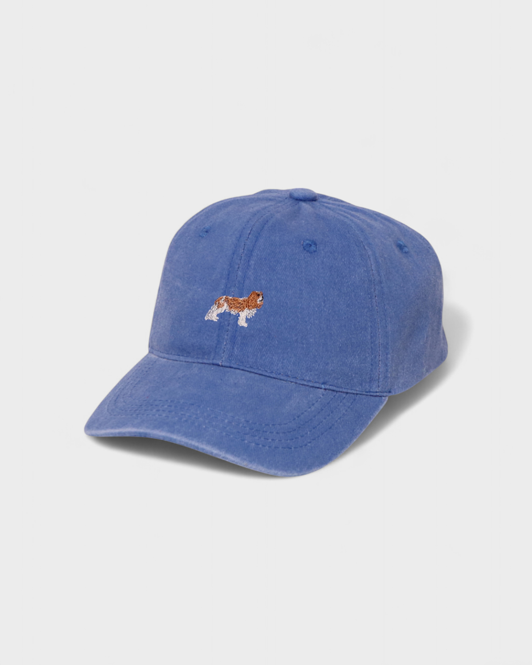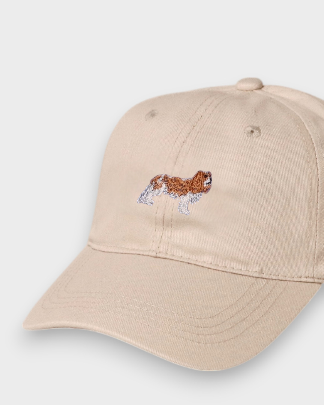 Our King Charles Spaniel Personalised Hat features our hand-drawn King Charles Spaniel embroidered design on the front and your choice of personalised embroidery on the back in our custom block or script font. This personalised hat is Ideal for those with a loveable KCS in their lives.