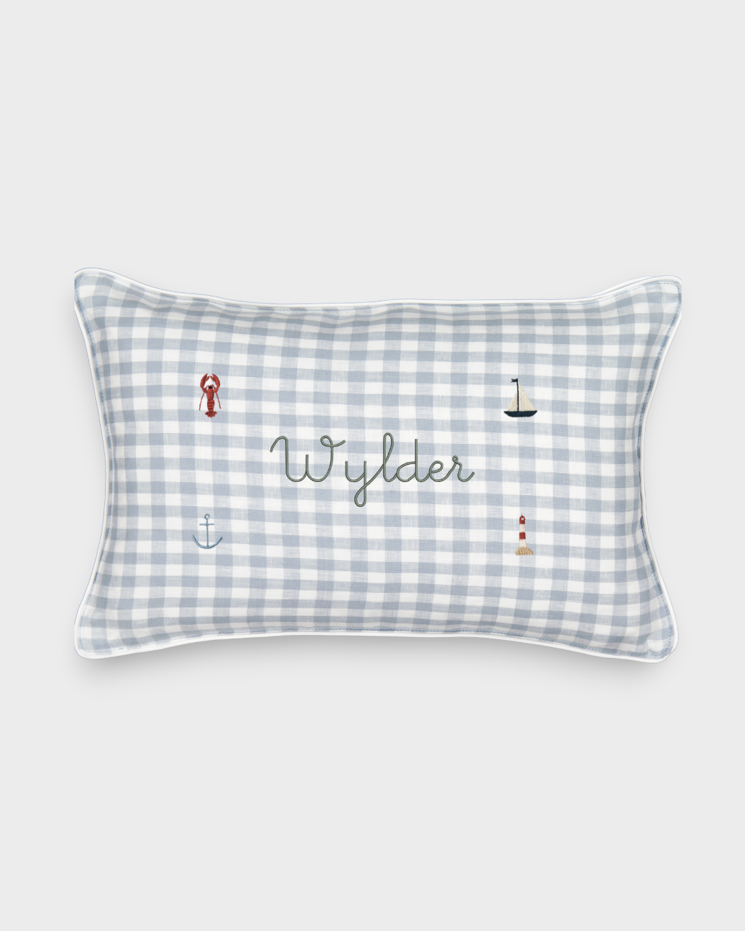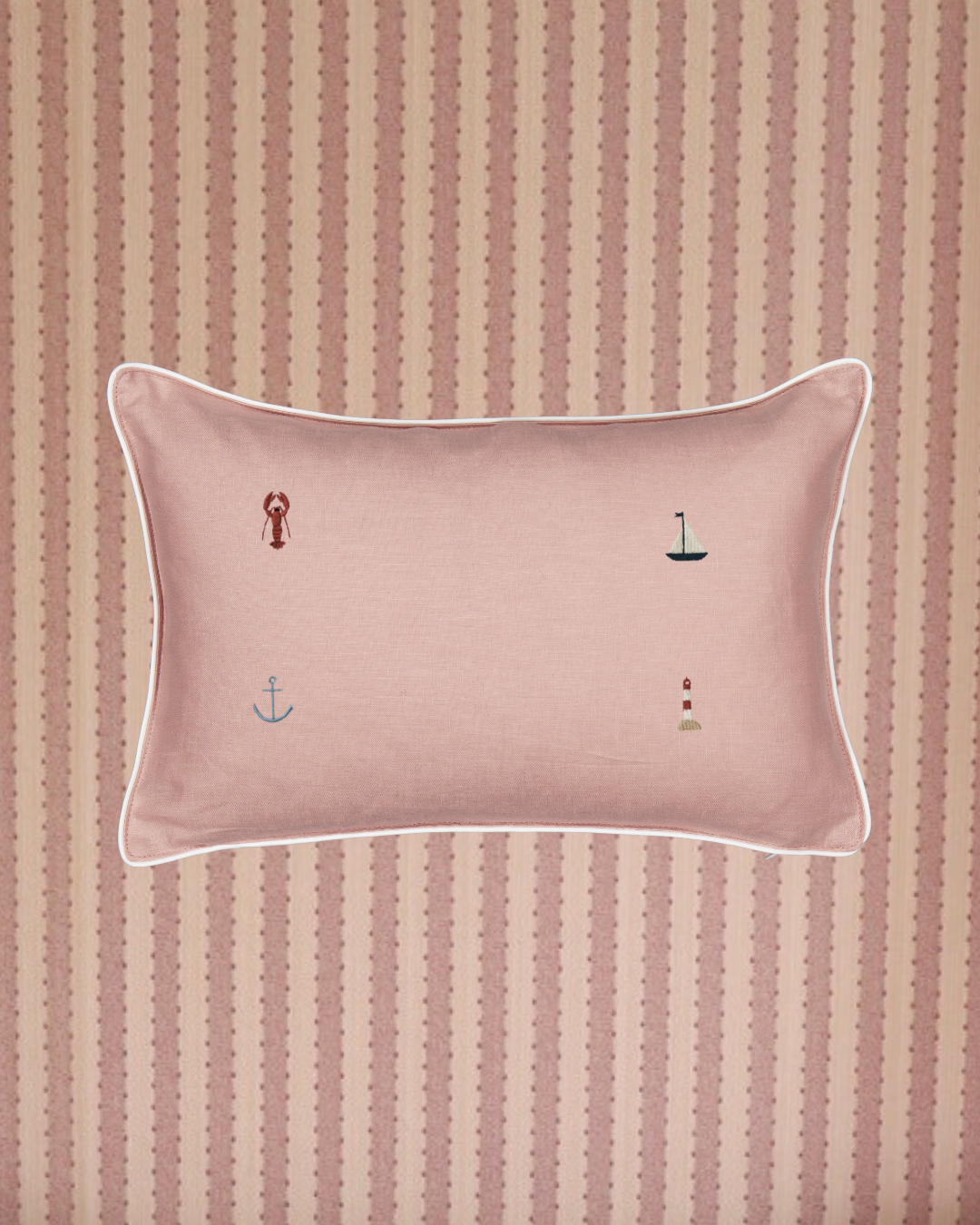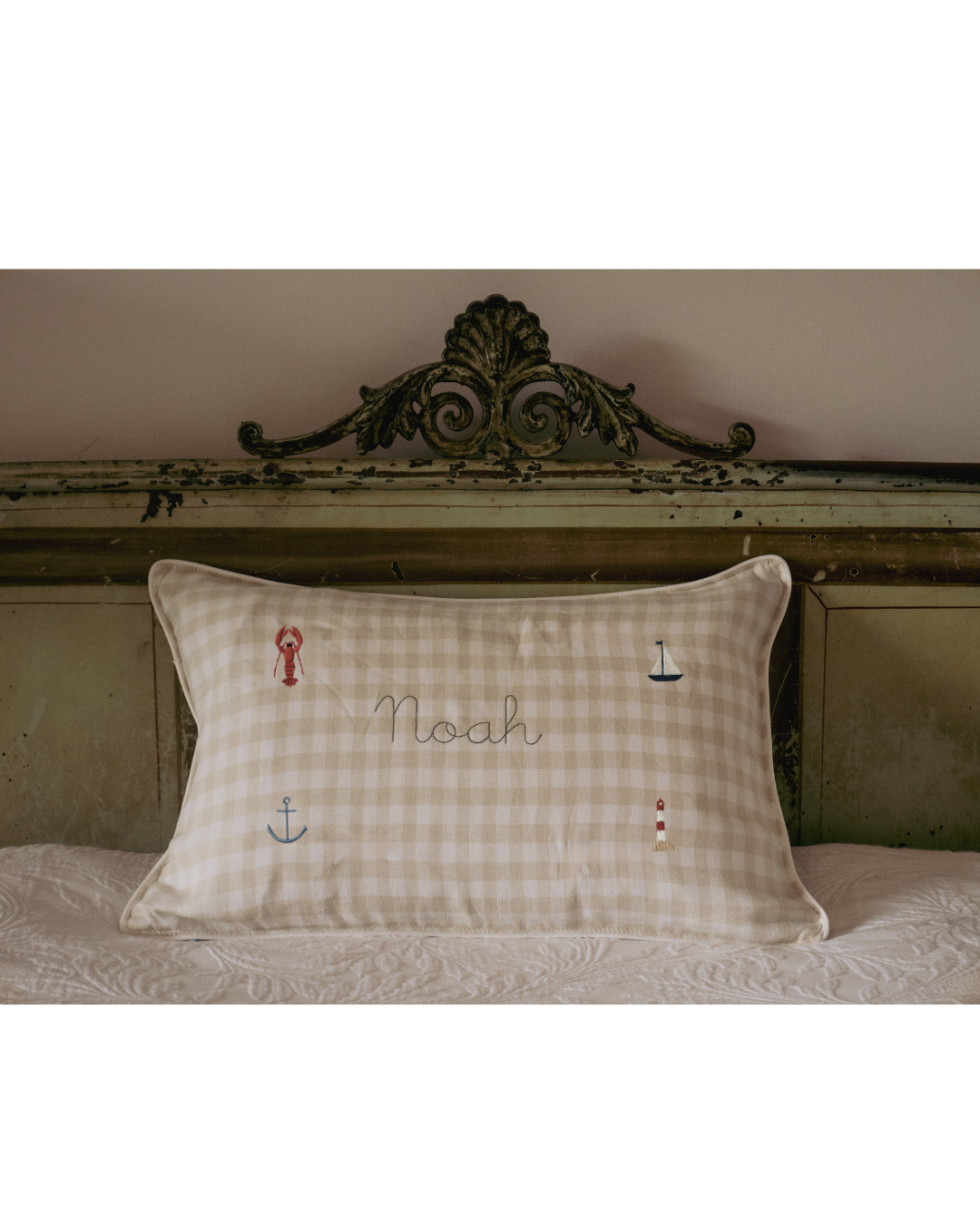 Nautical Keepsake Cushion features detailed needlework of hand-drawn designs of whimsical elements of life at sea.