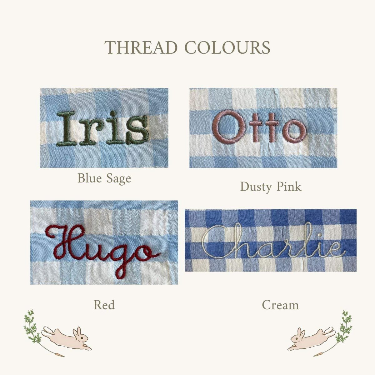 Our new gingham Easter Buckets features beautiful hand-drawn embroidery designs plus your personalisation in a range of styles and colours.