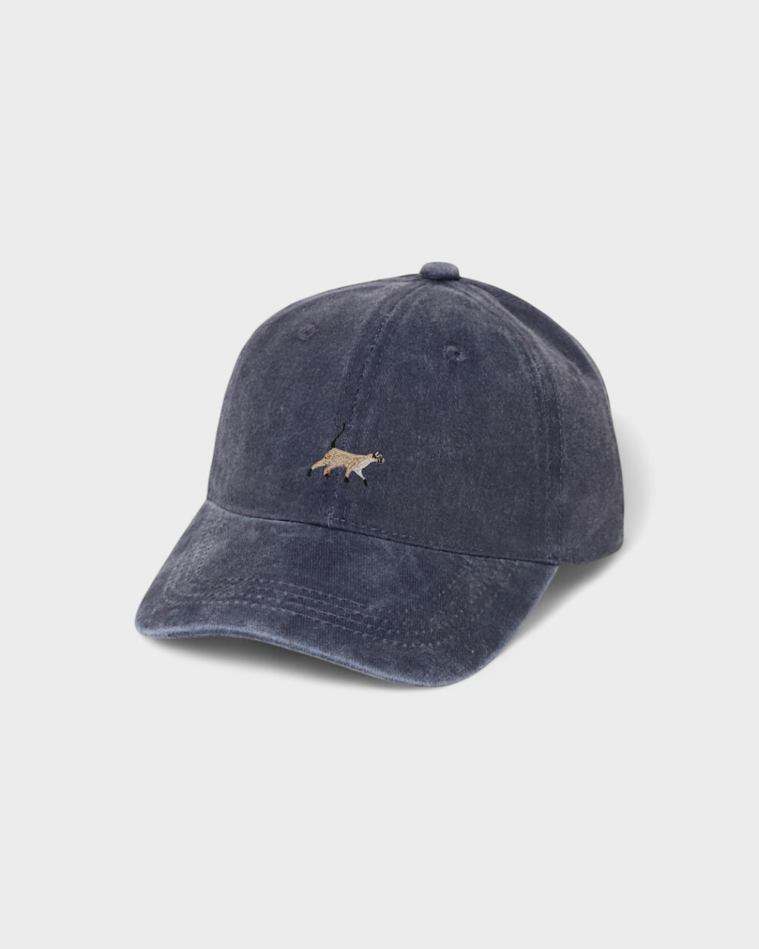 Navy washed cotton baseball cap with embroidered Siamese cat design and customizable back embroidery